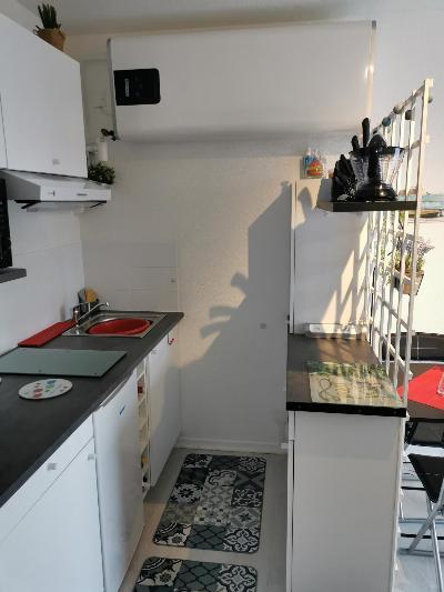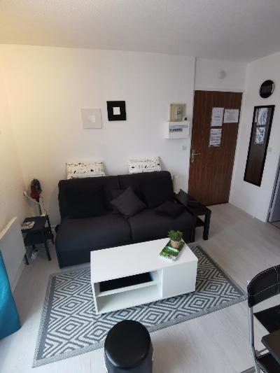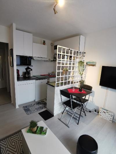 Studio de 19 m² pour 2 personnes comportant 1 pièce avec cuisine, salle d’eau, wc dans salle d’eau, salon (3 couchages : 1 lit simple, 1 canapé lit).