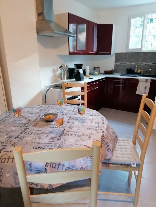 La disposition de l'appartement est la suivante : une cuisine entièrement équipée avec des plaques de cuisson induction , un four, une cafetière, une bouilloire et une table ronde pour 4 personnes, une chambre avec un lit double et un coin salon comprenant 2 fauteuils et une télévision, une salle d’eau avec douche, lave-linge et fenêtre, ainsi qu'un WC indépendant.