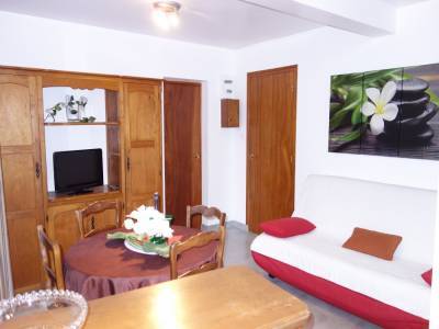 Appartement de 43 m² pour 5 personnes comportant 2 pièces avec cuisine, salle d’eau, wc dans salle d’eau, salon et 2 chambres à coucher (5 couchages : 1 lit double, 1 lit simple, 1 lit superposé, 1 canapé lit).