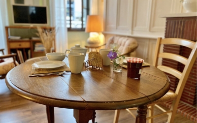 Le salon du rez-de-chaussée comprend un canapé 3 places, une télévision de 80 cm, une table et une connexion WIFI. La salle d’eau est équipée d’une douche, d’une vasque et d’une étagère.